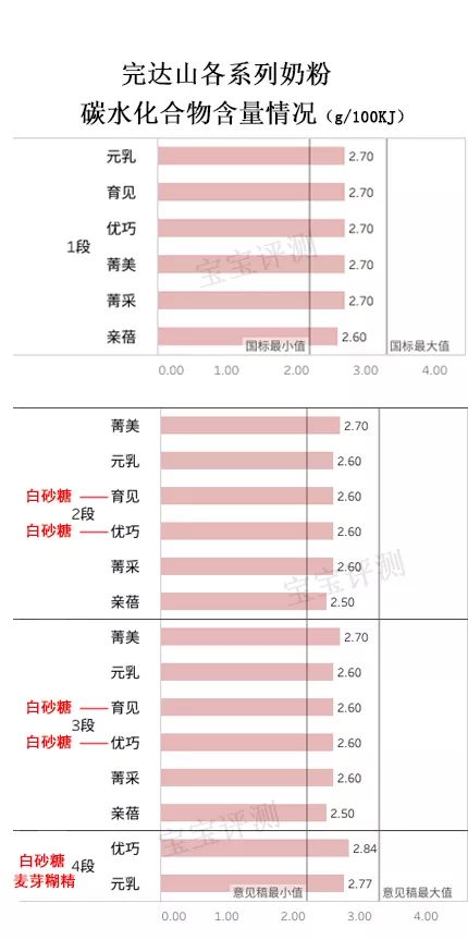①完达山各系列1段的碳水化合物含量均符合中国国标,2段及以上均符合新国标征求意见稿的参考范围。