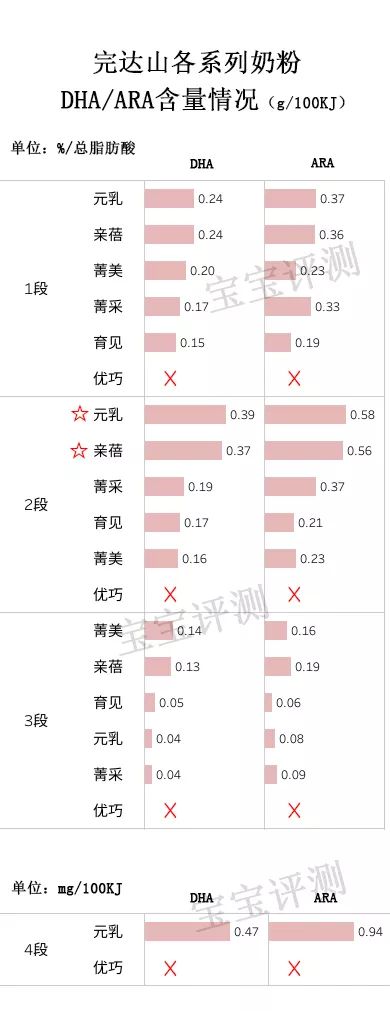 ②只有元乳、亲蓓2段DHA添加量较高,得到加分(☆)。其他系列的DHA含量偏低,很难说光靠吃奶粉能发挥多大的作用。
